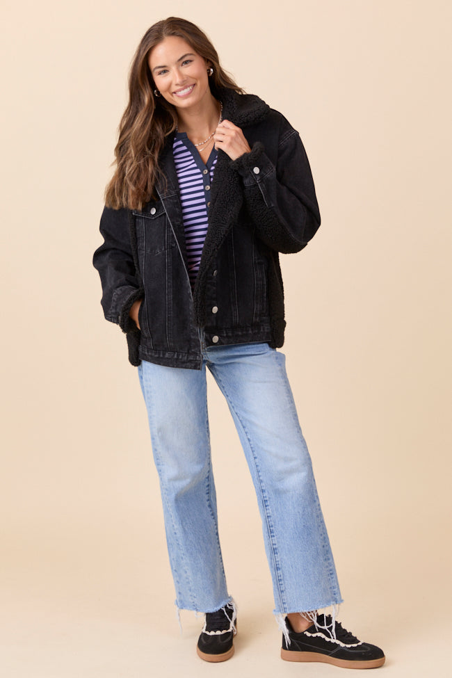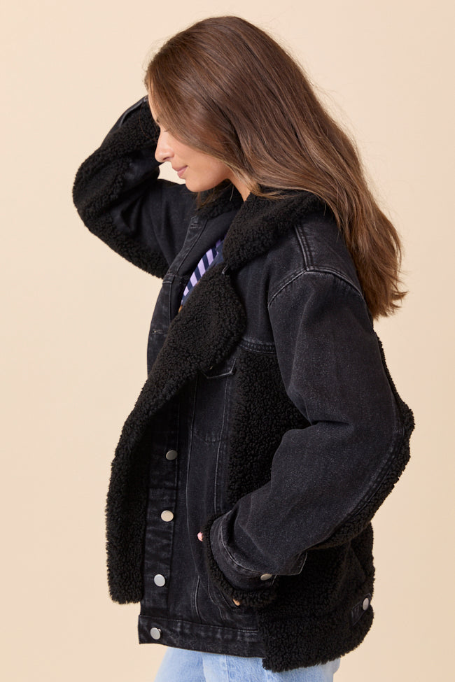 Picking Sides Black Wash Sherpa Detail Oversized Denim Jacket SALE