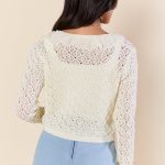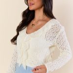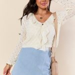 - V-neckline, button up closure, ruffle detail, ribbed hem